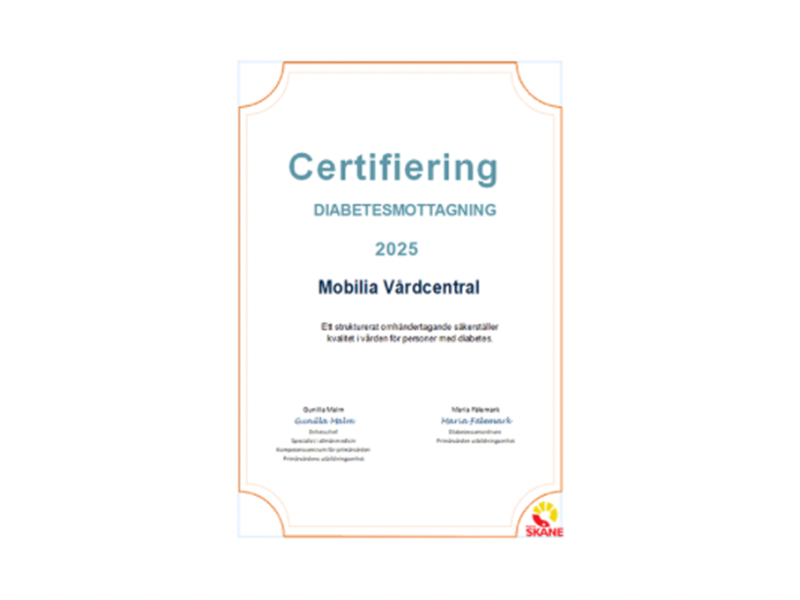 Certifiering av diabetesmottagning Mobilia Vårdcentral